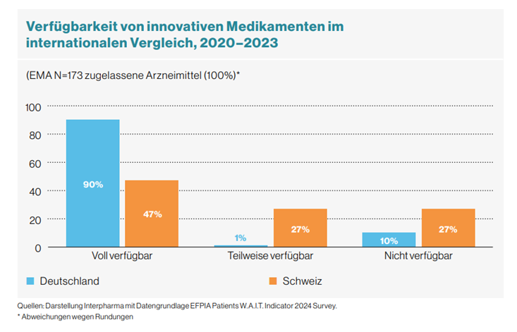 Für ein qualitativ hochstehendes Gesundheitswesen, das allen Patientinnen und Patienten offenstehen soll, ist das inakzeptabel. Ein Vergleich mit Deutschland zeigt den dringenden Nachholbedarf der Schweiz auf. In Deutschland sind rund 90 Prozent der neuen innovativen Medikamente, welche in der EMA in den Jahren 2020 bis 2023 zugelassen wurden, standardmässig verfügbar. In der Schweiz sind es mit 47 Prozent gerade einmal halb so viele wie in Deutschland. Jede zweite innovative Behandlungsmöglichkeit bleibt hierzulande unzugänglich. Dies nicht aus medizinischen, sondern aus administrativen Gründen. Deutschland muss hier der Benchmark sein.