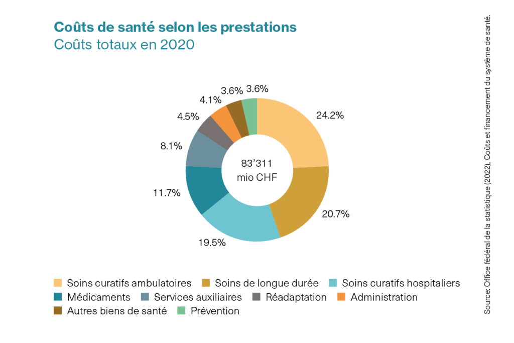 D’après les chiffres définitifs les plus récents de l’OFS, en 2020, les dépenses totales effectuées en Suisse pour le système de santé se sont montées à 83.3 milliards de francs, soit une croissance de +1% par rapport à 2019, inférieure à la tendance des années précédentes. La majeure partie des coûts, environ deux tiers, sont financés par les assurances sociales et les pouvoirs publics (Confédération, cantons, communes). Environ un cinquième sont directement à la charge des ménages privés. Près de deux tiers des coûts de santé, donc la plus grande partie, sont occasionnés par les traitements curatifs ambulatoires (24.2%), stationnaires (19.5%) et les soins de longue durée (20.7%). Les médicaments représentent quant à eux 11.7% de l’ensemble des dépenses de santé (9.7 milliards de francs).