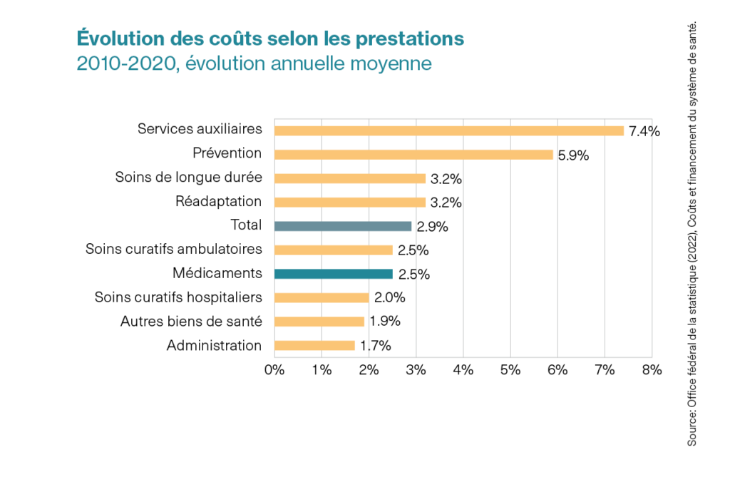 Le tableau est légèrement différent pour d’autres prestations du système de santé. Au cours des dix dernières années, les coûts de santé ont augmenté en moyenne de +2.9%. Les dépenses en médicaments ont augmenté de +2.5%, donc moins que les coûts de santé dans leur ensemble, ceci bien que de nombreux médicaments innovants soient arrivés sur le marché. Ce sont surtout des domaines comme la prévention et les services auxiliaires (p. ex. laboratoires, transports) qui enregistrent une forte hausse.