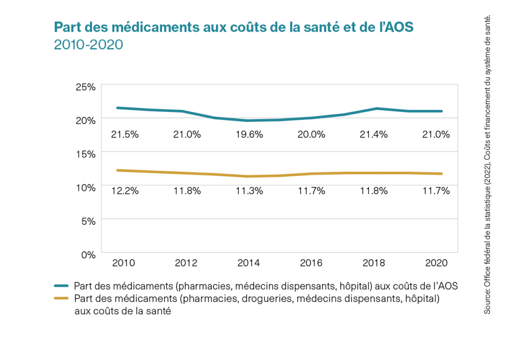 En 2020, leur part aux coûts de l’assurance obligatoire des soins (AOS) était de 21%. La part des médicaments aux coûts de l’AOS est plus élevée que leur part aux coûts globaux, car contrairement à d’autres groupes de prestations (par exemple aux traitements curatifs stationnaires), environ trois quarts des médicaments sont financés par le biais de l’assurance-maladie. Si on observe tout le «gâteau» (cf. graphique ci-dessus), on voit que la part des médicaments de 11.7% aux coûts de santé en 2020 n’était certes pas négligeable, mais pas non plus dominante. On peut donc dire que sur 100 francs dépensés dans le système de santé, un peu moins de 12 le sont pour des médicaments. L’évolution dans le temps montre en outre clairement que la part des médicaments aux coûts de santé est stable depuis de nombreuses années.