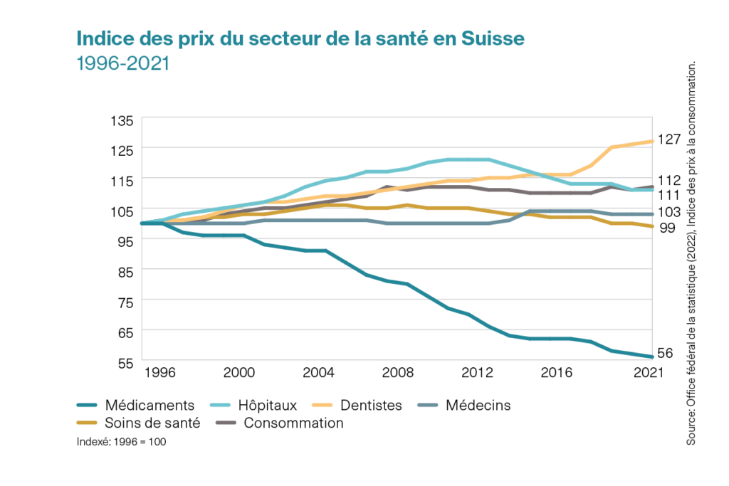 Depuis l’introduction de la LAMal, l’indice des prix des médicaments a baissé de 44%
