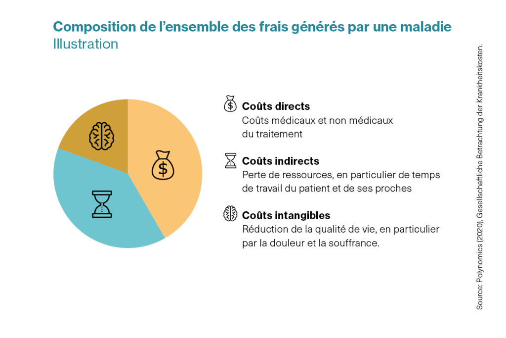 Dans le débat parfois très unilatéral sur les coûts de santé, on oublie souvent que les médicaments ne sont pas juste un facteur de coûts pour le système de santé, mais peuvent aussi générer toutes sortes de bénéfices. Là encore, il est donc utile de faire un pas en arrière pour observer le tableau dans son ensemble. Certes, les maladies pèsent en premier lieu sur les personnes malades, mais il y a souvent encore d’autres personnes concernées: les assureurs-maladie supportent les coûts des traitements médicaux, les employeurs déplorent des pertes de productivité et l’environnement personnel du patient ressent aussi les conséquences de la maladie. On peut donc distinguer les coûts directs (traitements médicaux et non médicaux), les coûts indirects (pertes de ressources, par exemple la main-d’œuvre qui manque pour cause de maladie) et les coûts intangibles (réduction de la qualité de vie). La somme représente les frais entraînés par la maladie pour la société.