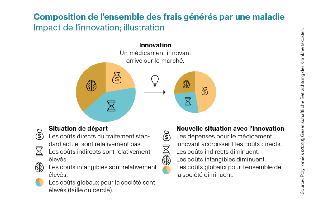 Les médicaments innovants peuvent avoir un impact sur les trois types de coûts: ainsi une innovation fait-elle en général augmenter les coûts de traitement directs, tandis que les coûts indirects et intangibles diminuent. En effet, si les patient-e-s vont mieux, voire guérissent, leur qualité de vie s’améliore et, bien souvent, ils reviennent plus rapidement sur le marché du travail, ce qui décharge les assurances sociales. On peut donc s’attendre à ce qu’un médicament innovant fasse diminuer au final le «gâteau» de coûts que la maladie génère pour les personnes touchées et pour l’ensemble de la société. Cela veut dire que les coûts de la maladie baissent au total pour la société. Du point de vue économique global, il est donc décisif de savoir si le nouveau traitement fait baisser l’ensemble des frais de maladie. L’évolution de la composition de l’ensemble des coûts est accessoire.
